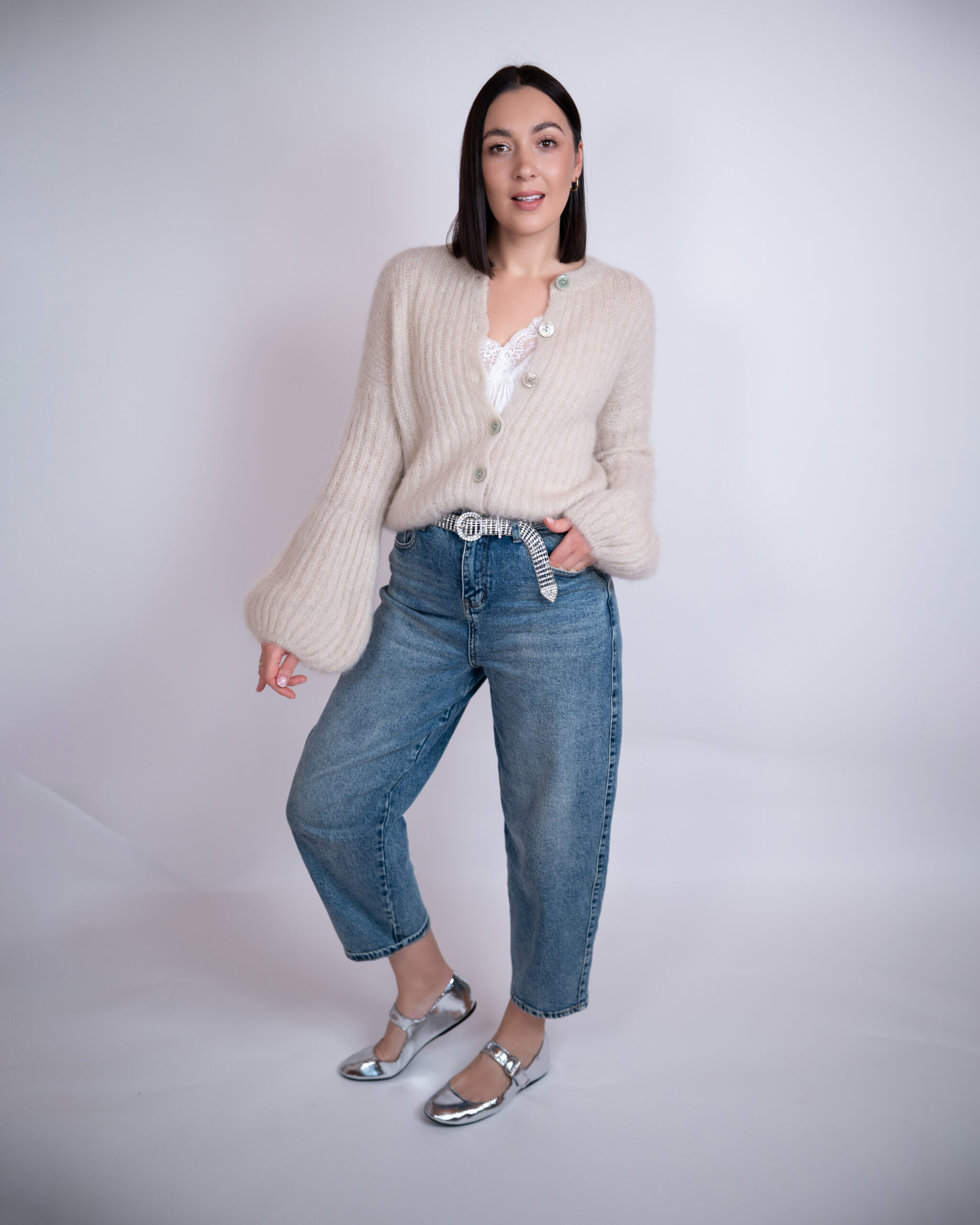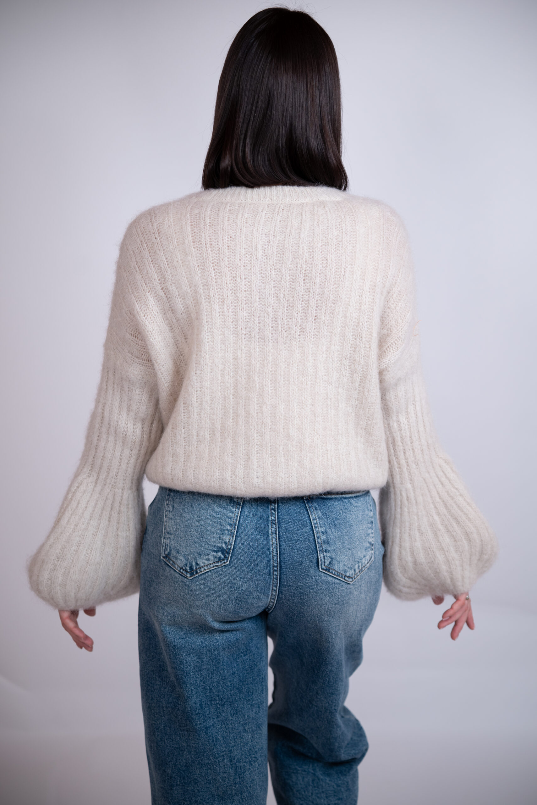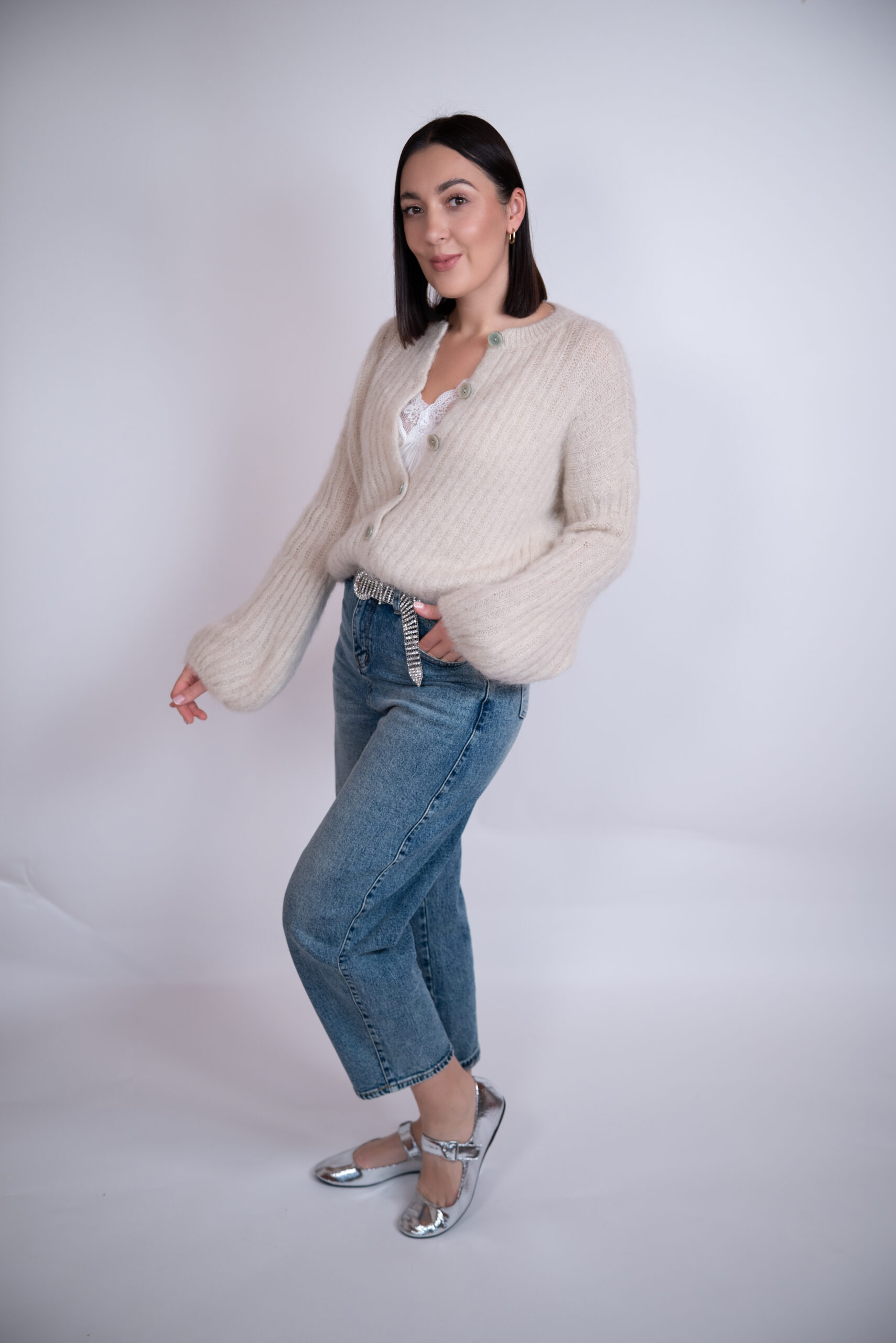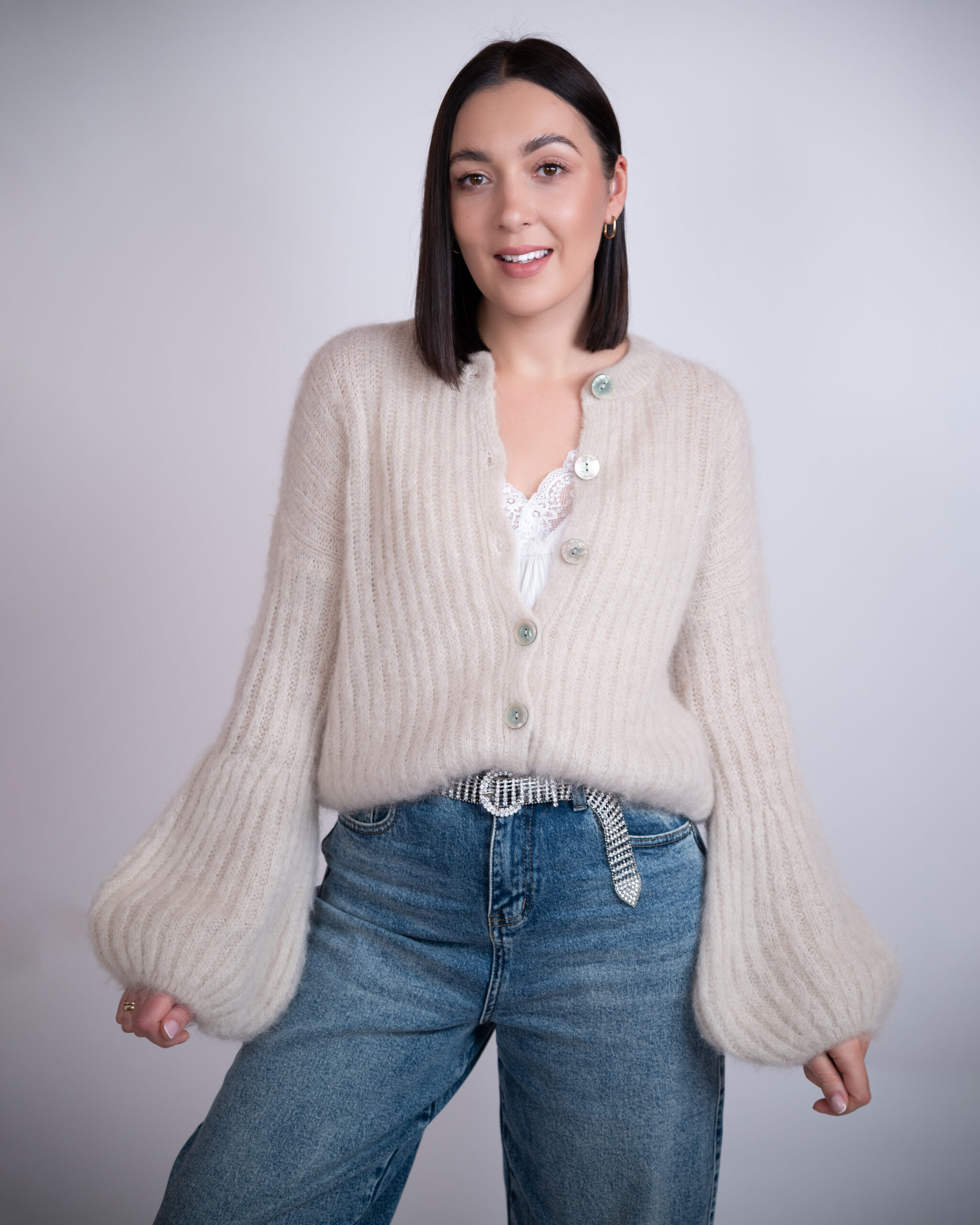 Kremowa elegancja .Absolutny bestseller – sweter ABBY w wersji  kardigan w jasnym, świeżym kolorze to kwintesencja stylu i wygody. Wykonany z najwyższej jakości wełny kid moher, otula miękkością i zapewnia komfort noszenia. Oversizowy fason zakończony ściągaczem u dołu i spektakularne rękawy-bombki dodają mu lekkości i wyjątkowego charakteru. To model, który wyróżni Cię w tłumie, a jednocześnie pozostanie ponadczasowy. Idealnie sprawdzi się w połączeniu z eleganckimi spodniami z wysokim stanem i szpilkami, ale też w casualowym zestawie z dżinsami i mokasynami.