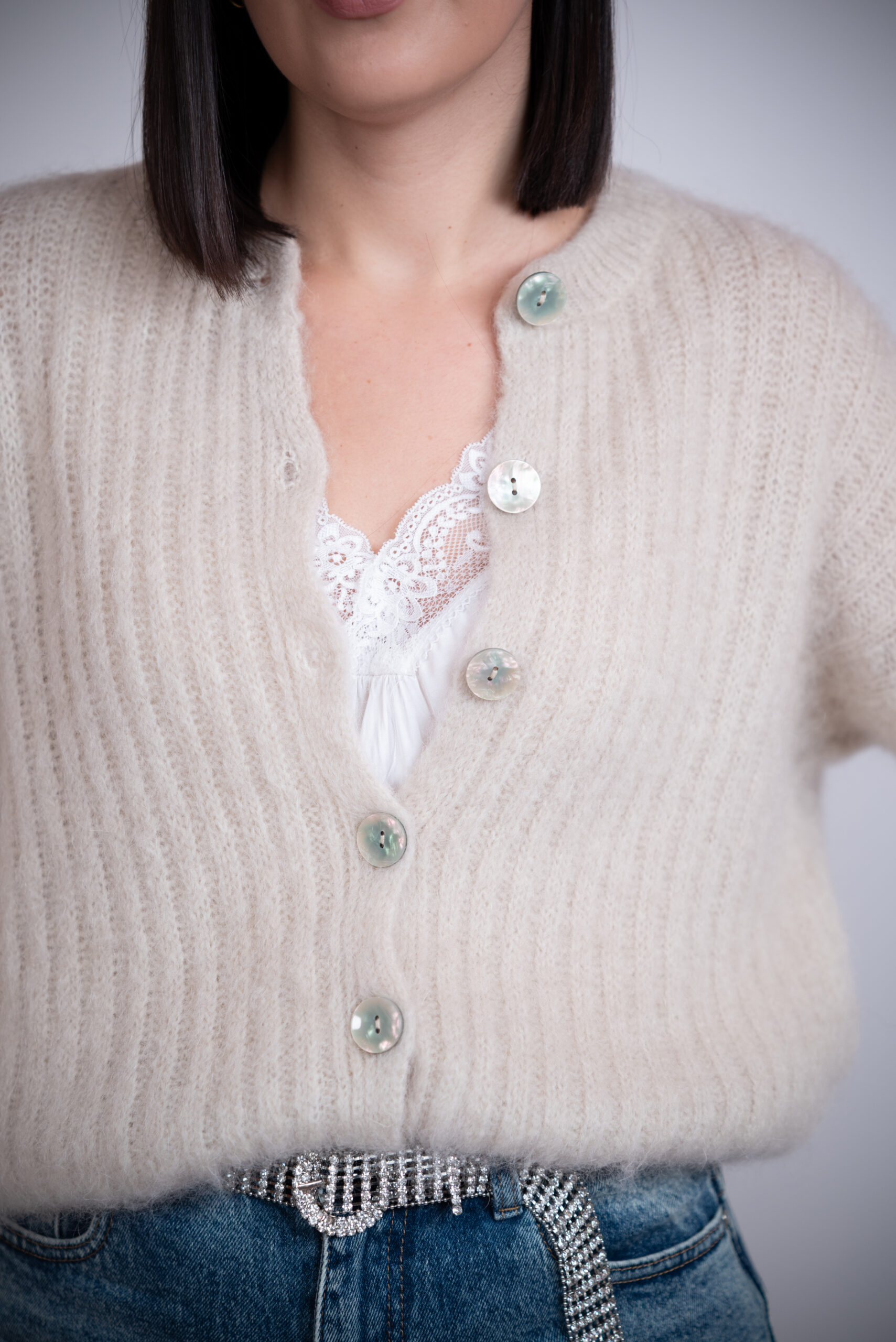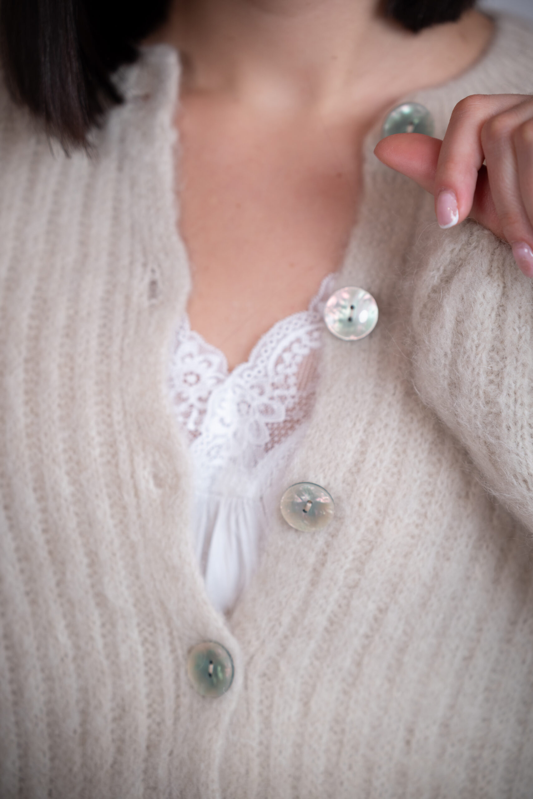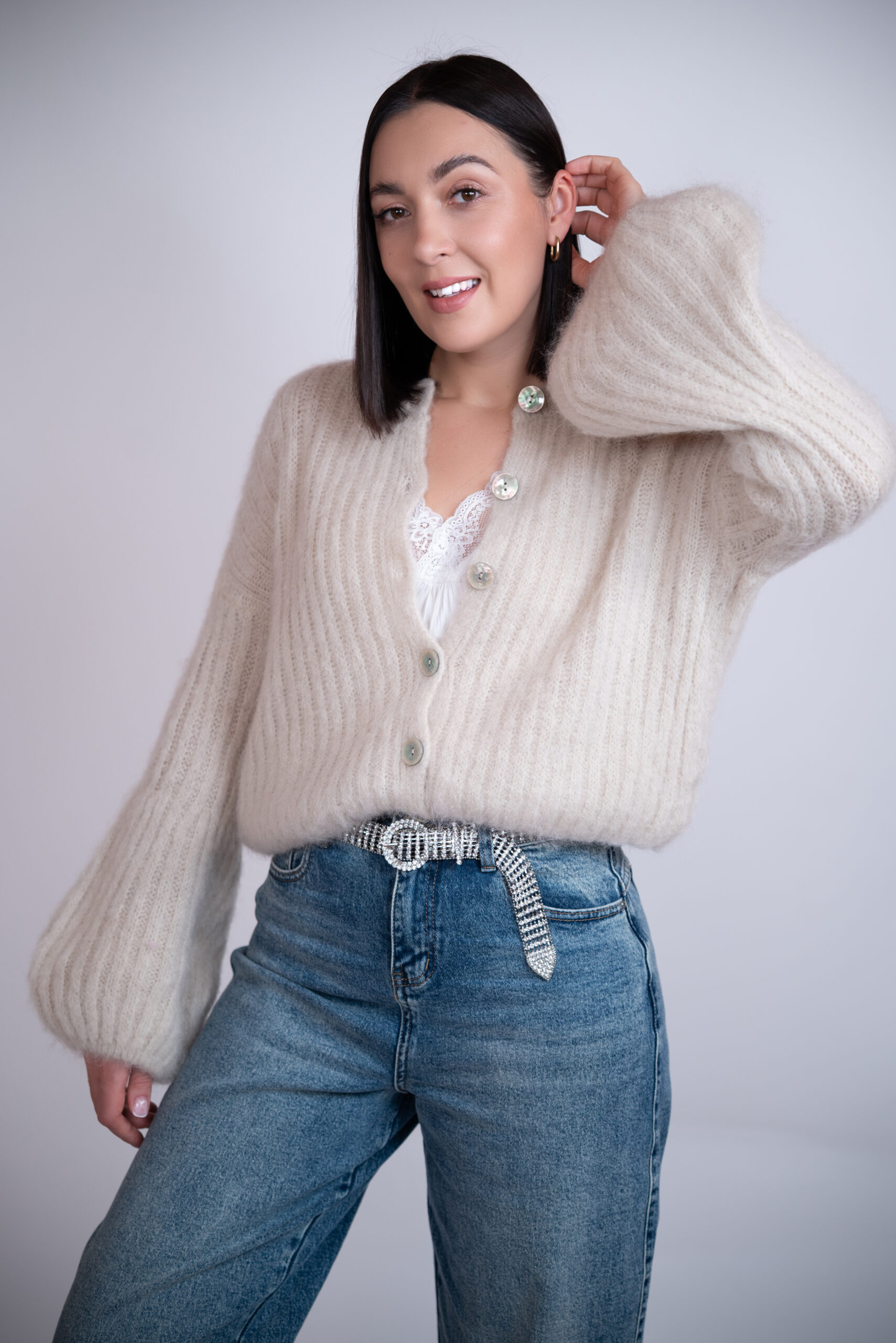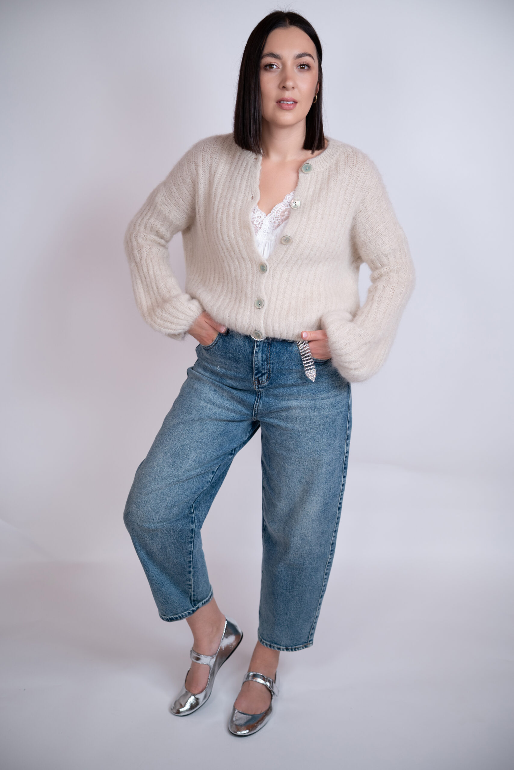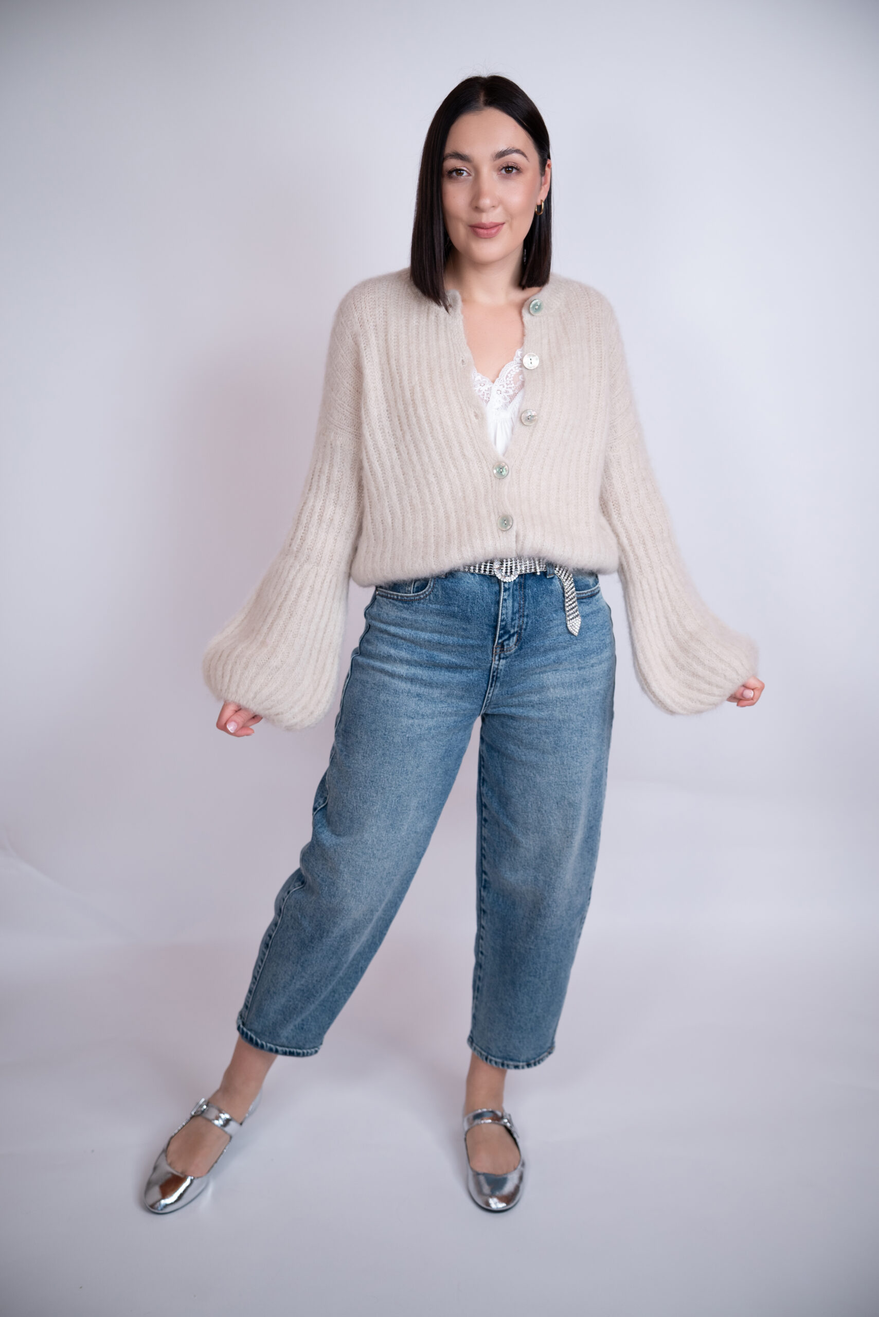 Kremowa elegancja .Absolutny bestseller – sweter ABBY w wersji  kardigan w jasnym, świeżym kolorze to kwintesencja stylu i wygody. Wykonany z najwyższej jakości wełny kid moher, otula miękkością i zapewnia komfort noszenia. Oversizowy fason zakończony ściągaczem u dołu i spektakularne rękawy-bombki dodają mu lekkości i wyjątkowego charakteru. To model, który wyróżni Cię w tłumie, a jednocześnie pozostanie ponadczasowy. Idealnie sprawdzi się w połączeniu z eleganckimi spodniami z wysokim stanem i szpilkami, ale też w casualowym zestawie z dżinsami i mokasynami.