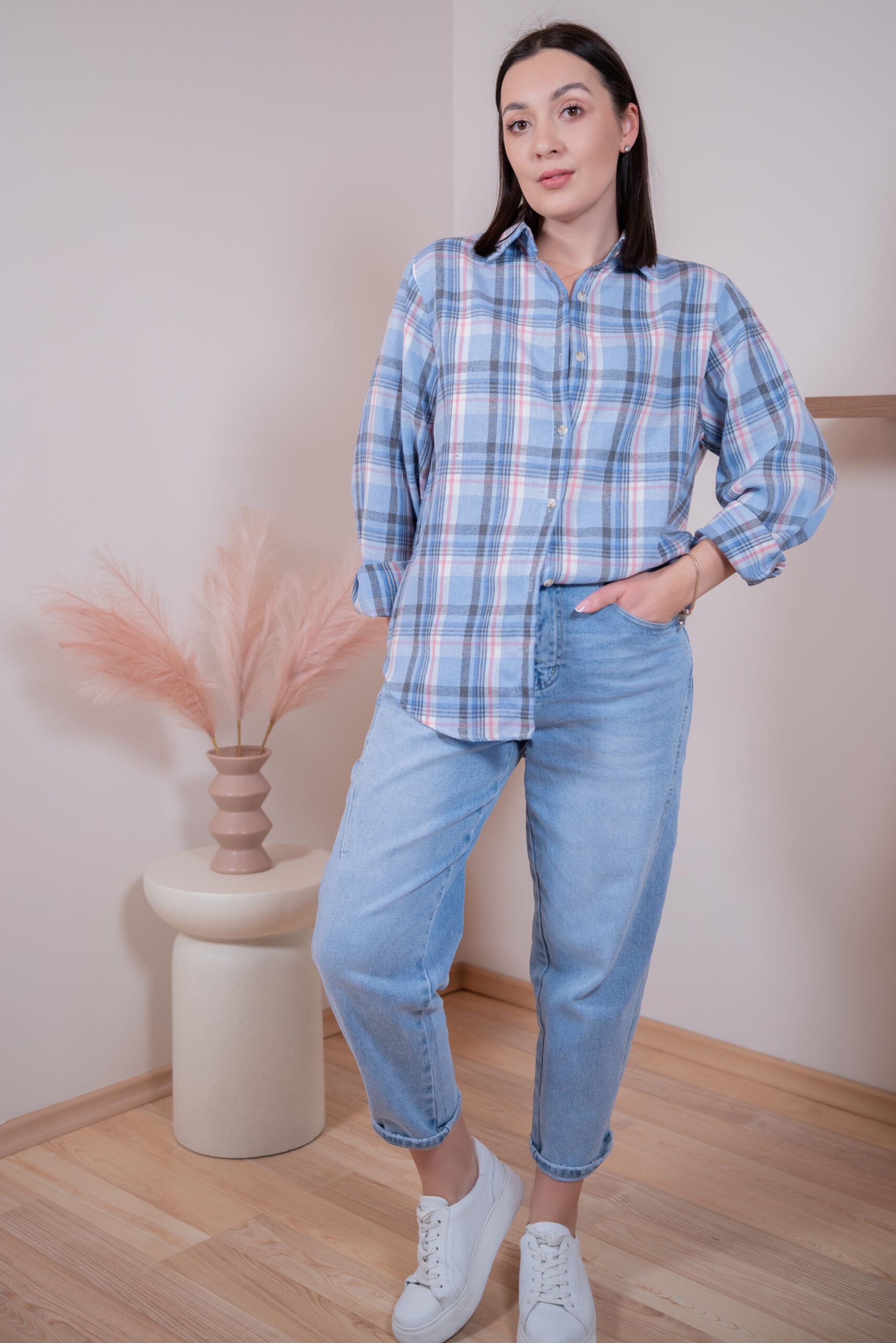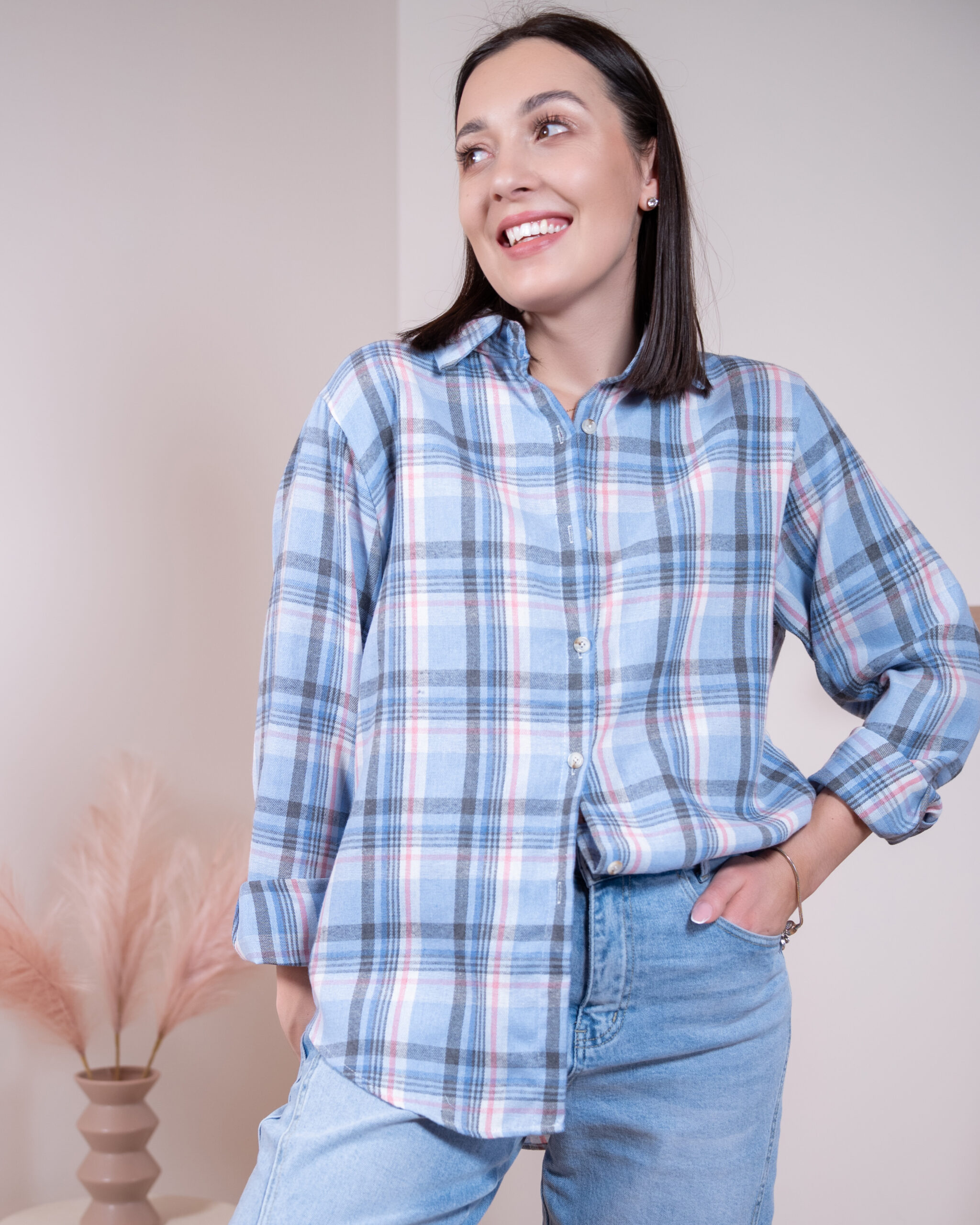 Koszula Elodie to subtelna, elegancka interpretacja klasycznej koszuli w kratę. Pastelowe odcienie błękitu, różu i szarości tworzą harmonijną, bardzo stylową całość. Lekko oversizowy krój zapewnia komfort i swobodę noszenia, a jednocześnie pięknie układa się na sylwetce. Niezwykle miękki materiał sprawia, że koszula jest przyjemna dla skóry i doskonale sprawdzi się przez cały dzień. To uniwersalny model, który świetnie wygląda zarówno z jeansami, jak i bardziej eleganckimi spodniami czy spódnicą.