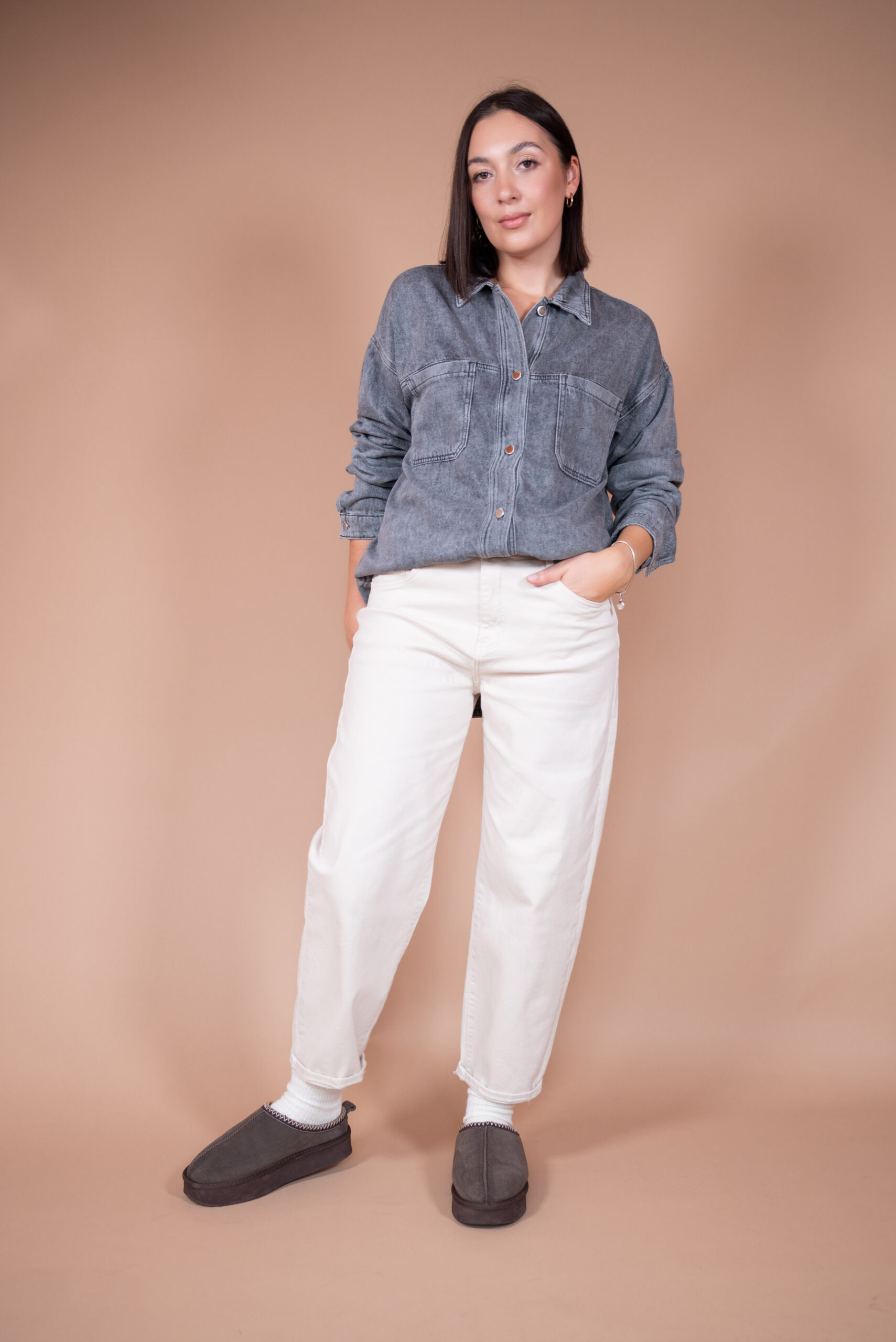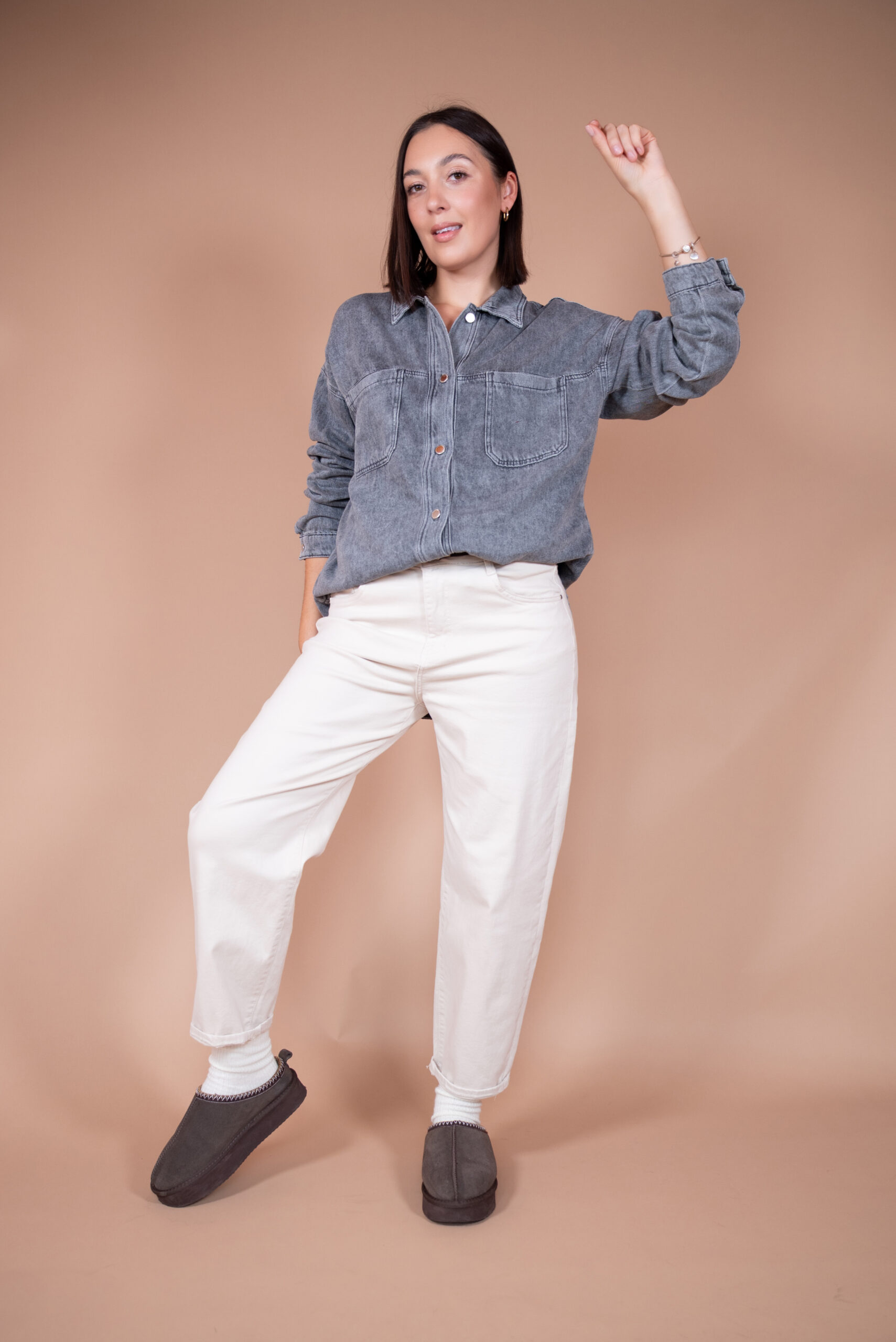 Jeansowa koszula to absolutny must have w każdej szafie! Ponadczasowa i całoroczna – z powodzeniem zastąpi klasyczną koszulę, lekką kurtkę czy plażową narzutkę. Koszula Nika zachwyca kolorem ciemno szarego, denimu oraz niezwykle miękkim, a jednocześnie stabilnym materiałem, który doskonale trzyma formę. Delikatnie luźniejszy krój gwarantuje komfort i swobodę stylizacji. Świetnie wygląda wiązana w talii z letnimi sukienkami, w połączeniu z białymi spodniami, a także w denimowym total looku z szortami lub długimi jeansami.