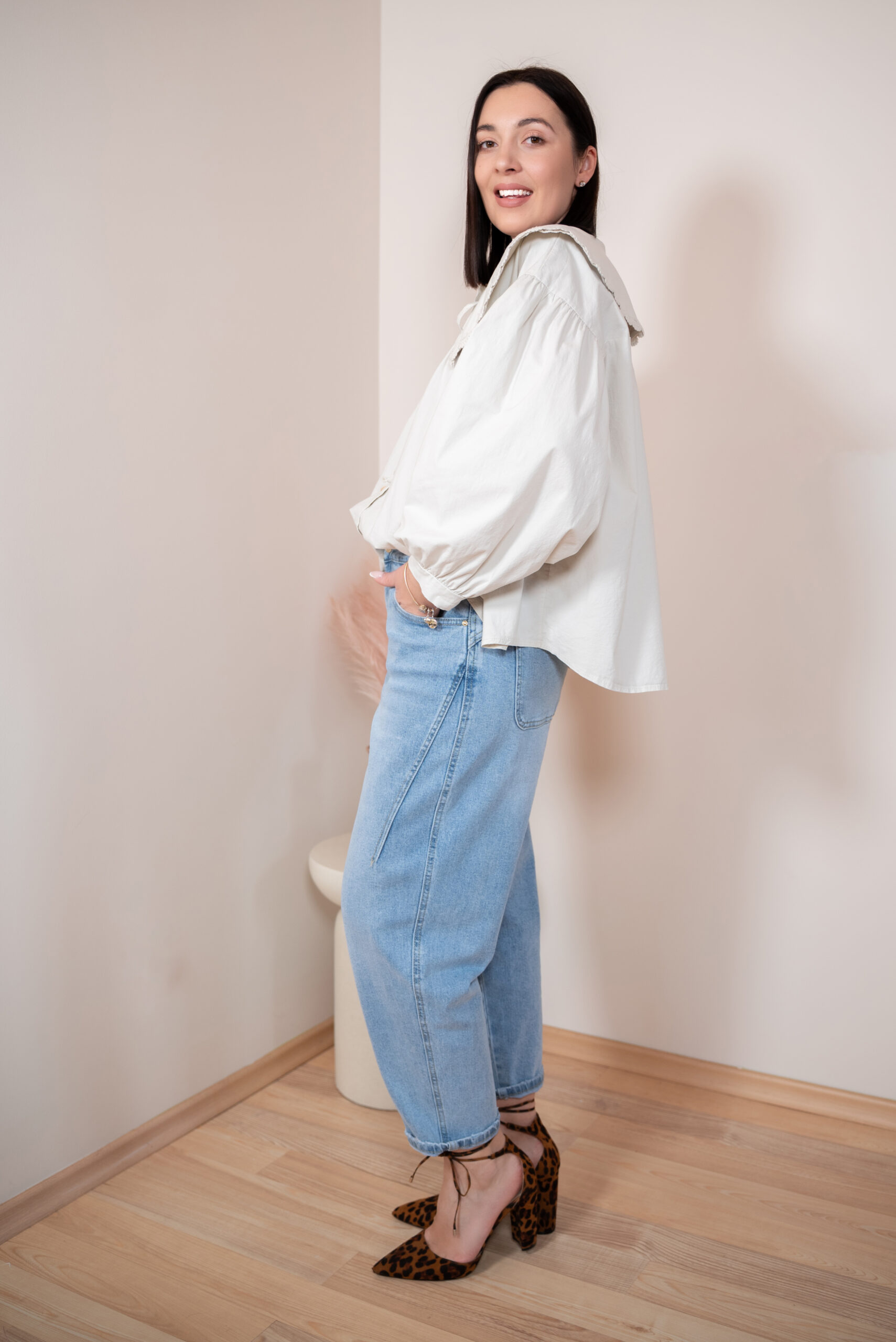 Całość dopełnia tłoczony wzór liści w beżowym odcieniu, który nadaje koszuli wyjątkowej głębi i eleganckiego wyrazu. Koszula Olivia doskonale sprawdzi się zarówno w stylizacjach romantycznych, jak i tych bardziej codziennych – pięknie wygląda zestawiona z jeansami, spódnicą czy klasycznymi spodniami, tworząc stylowy i dopracowany look.