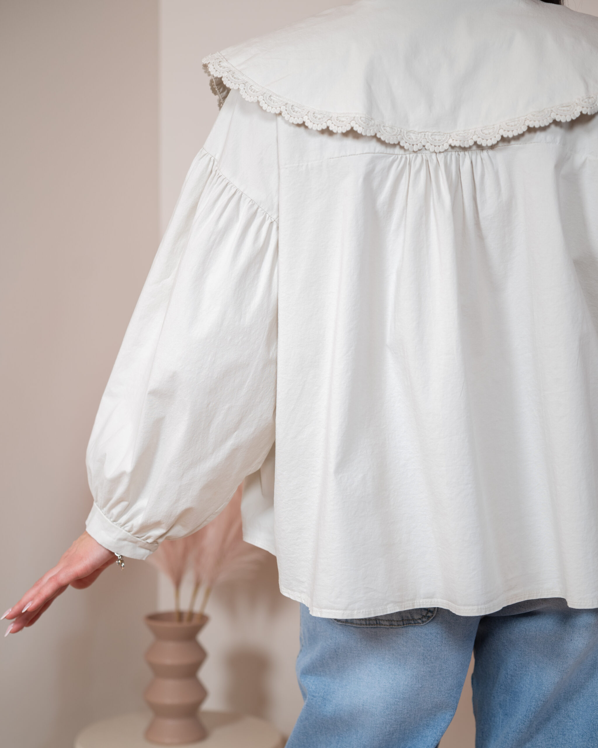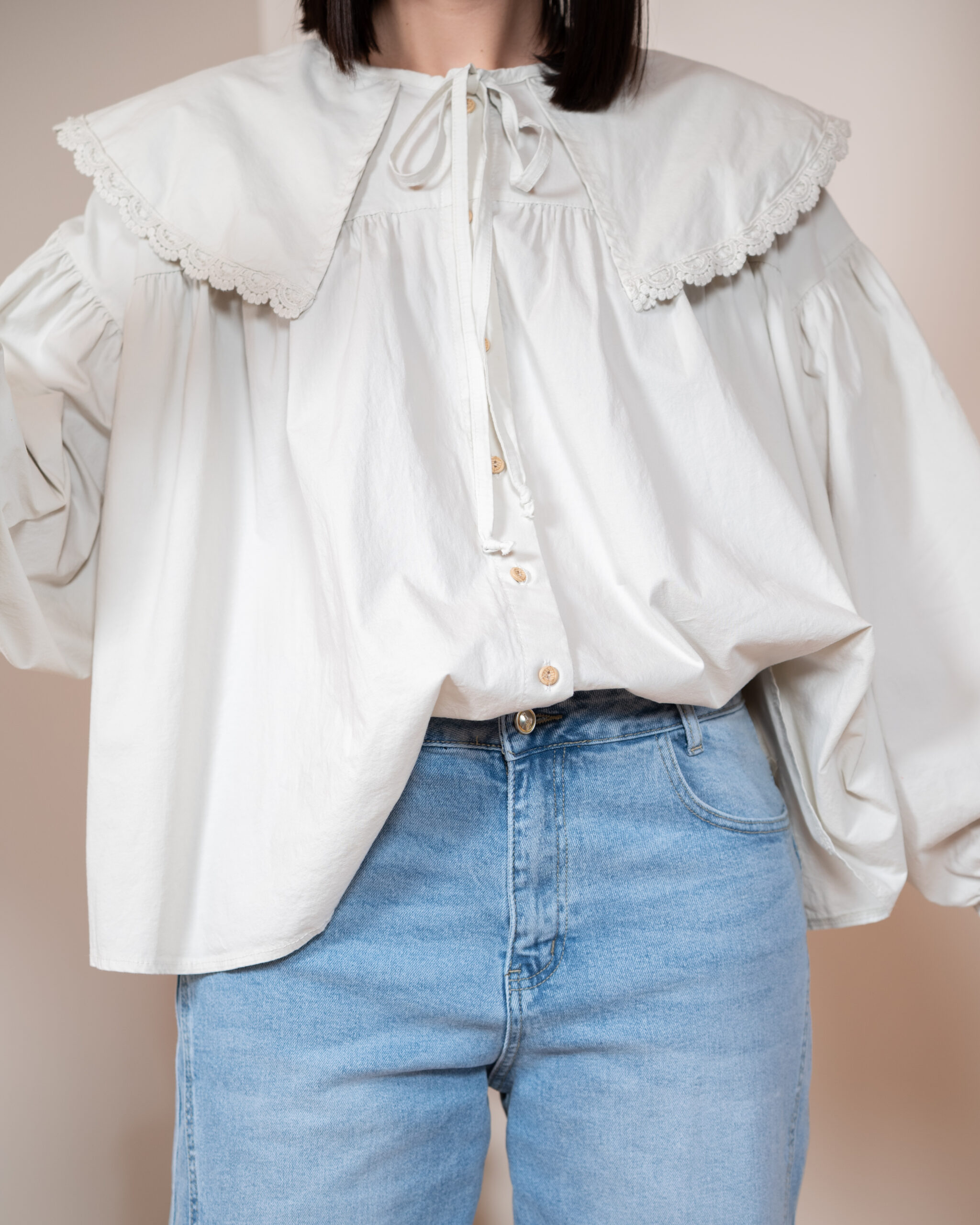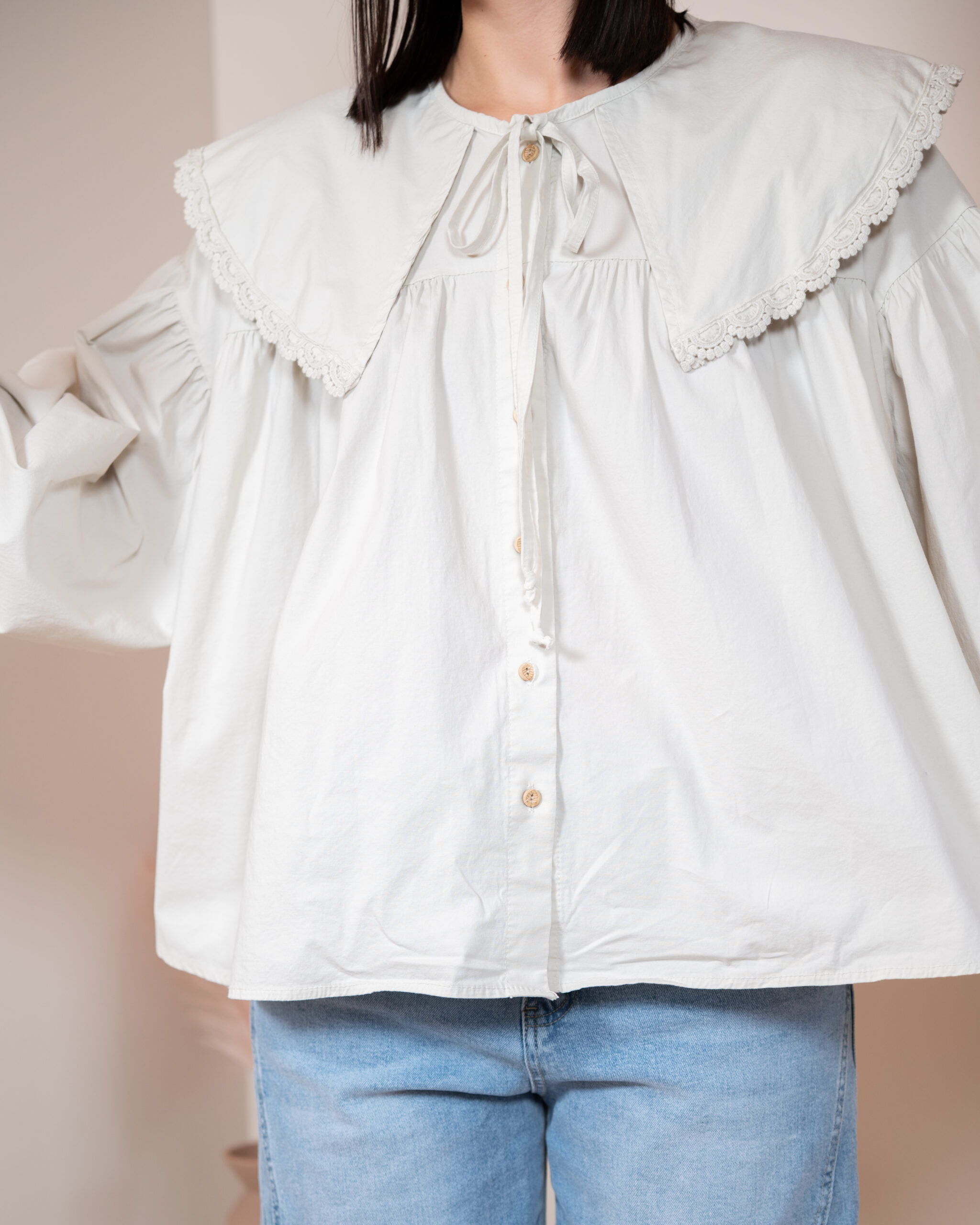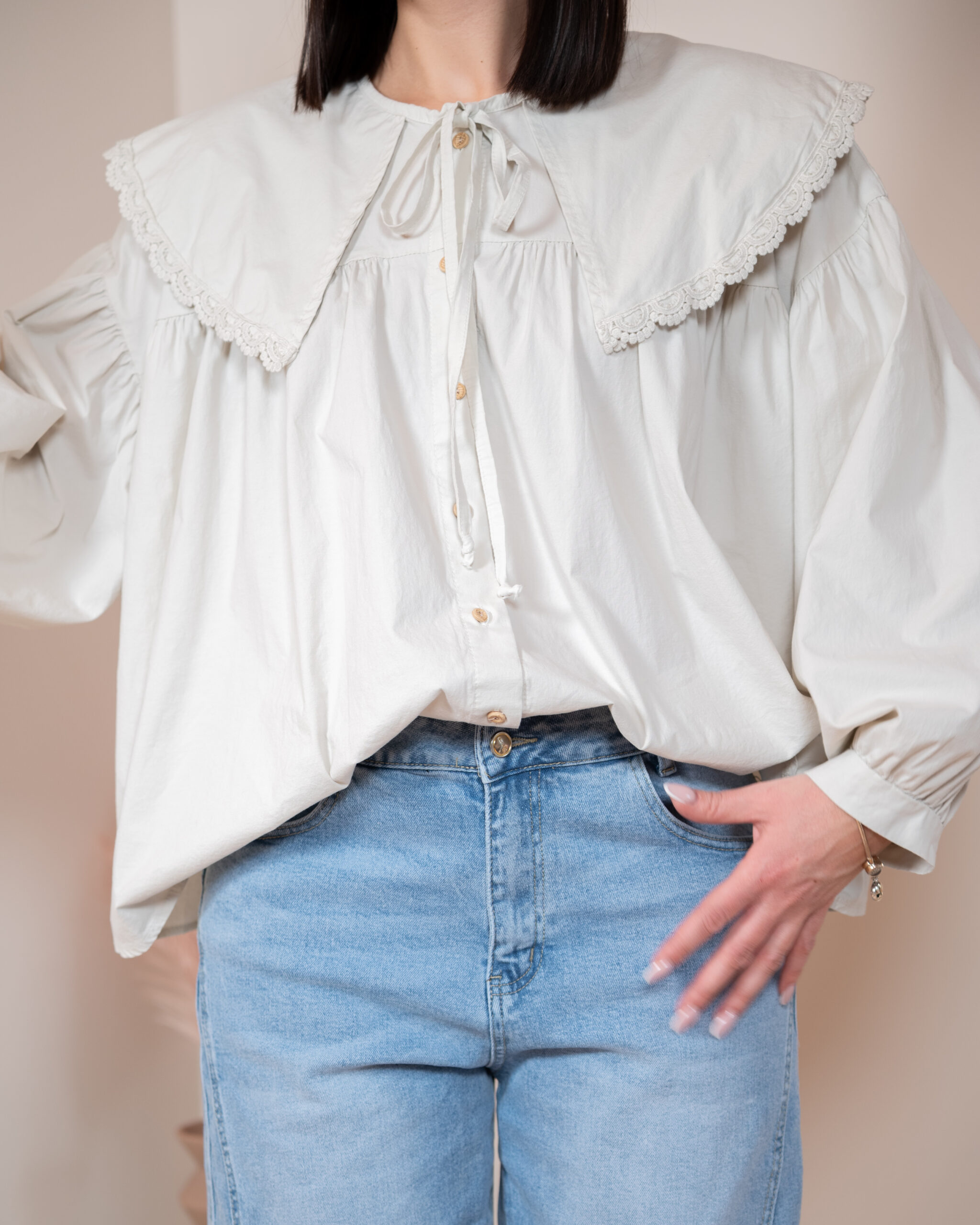 Szerokie, długie rękawy typu bufki zostały wykończone cienkim, eleganckim mankietem, który pięknie równoważy objętość rękawa. Główną rolę w tym modelu gra jednak duży, okrągły kołnierz obszyty delikatną koronką w tym samym kolorze – romantyczny, subtelny i niezwykle stylowy. Z przodu znajdują się dwa cienkie troczki, które można zawiązać w kokardę, dodając koszuli dziewczęcego uroku.