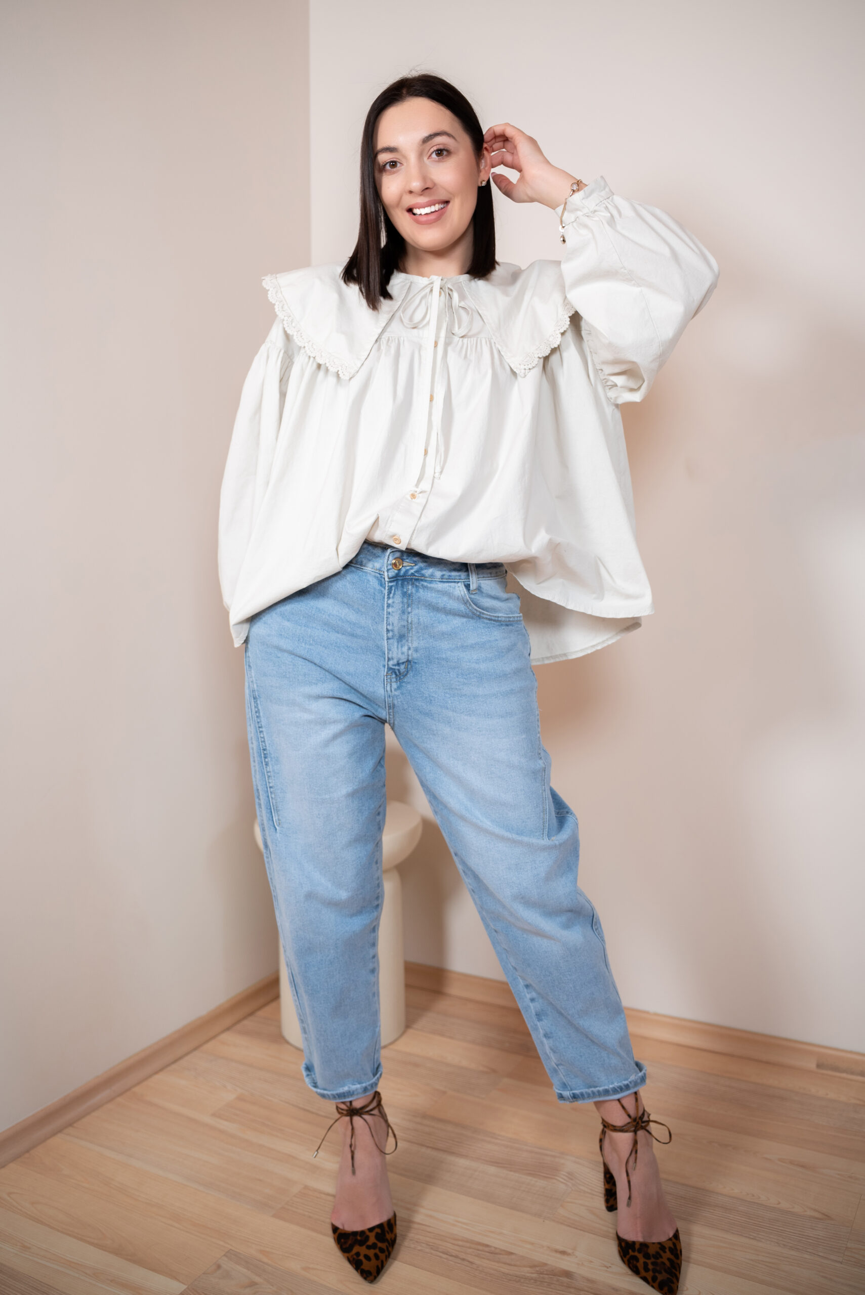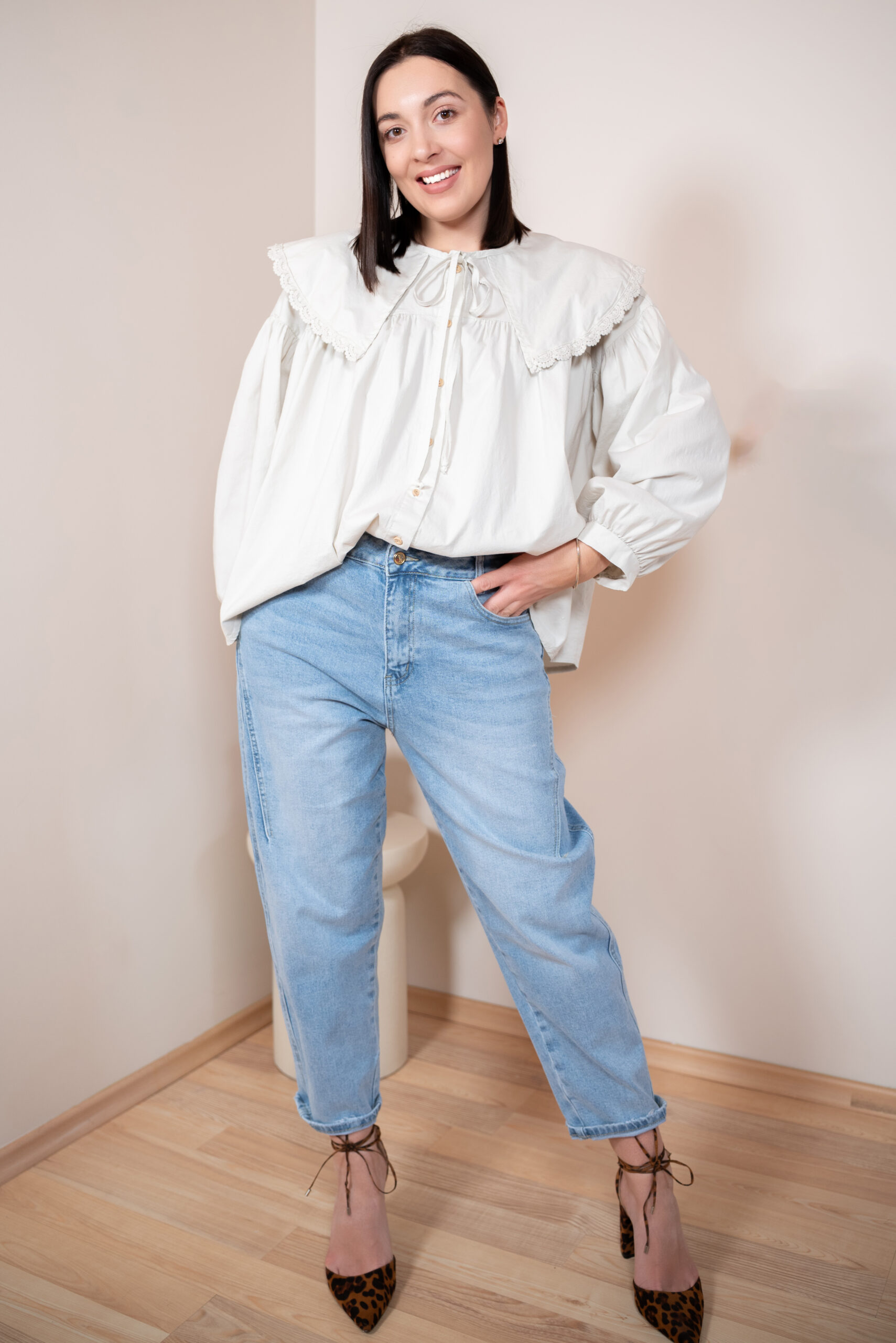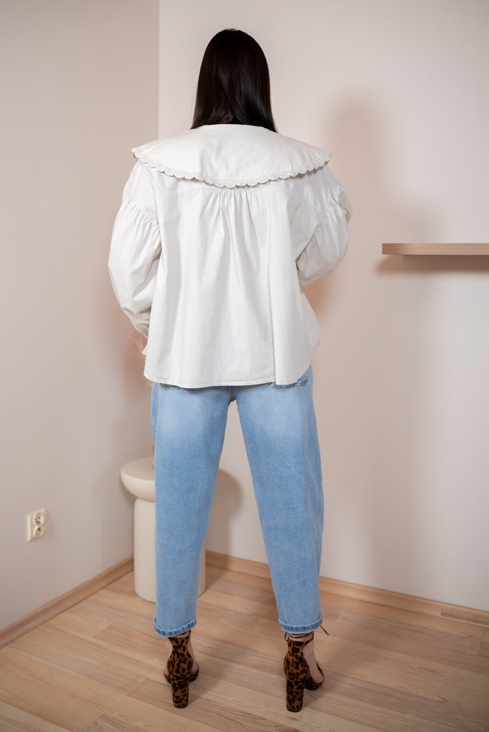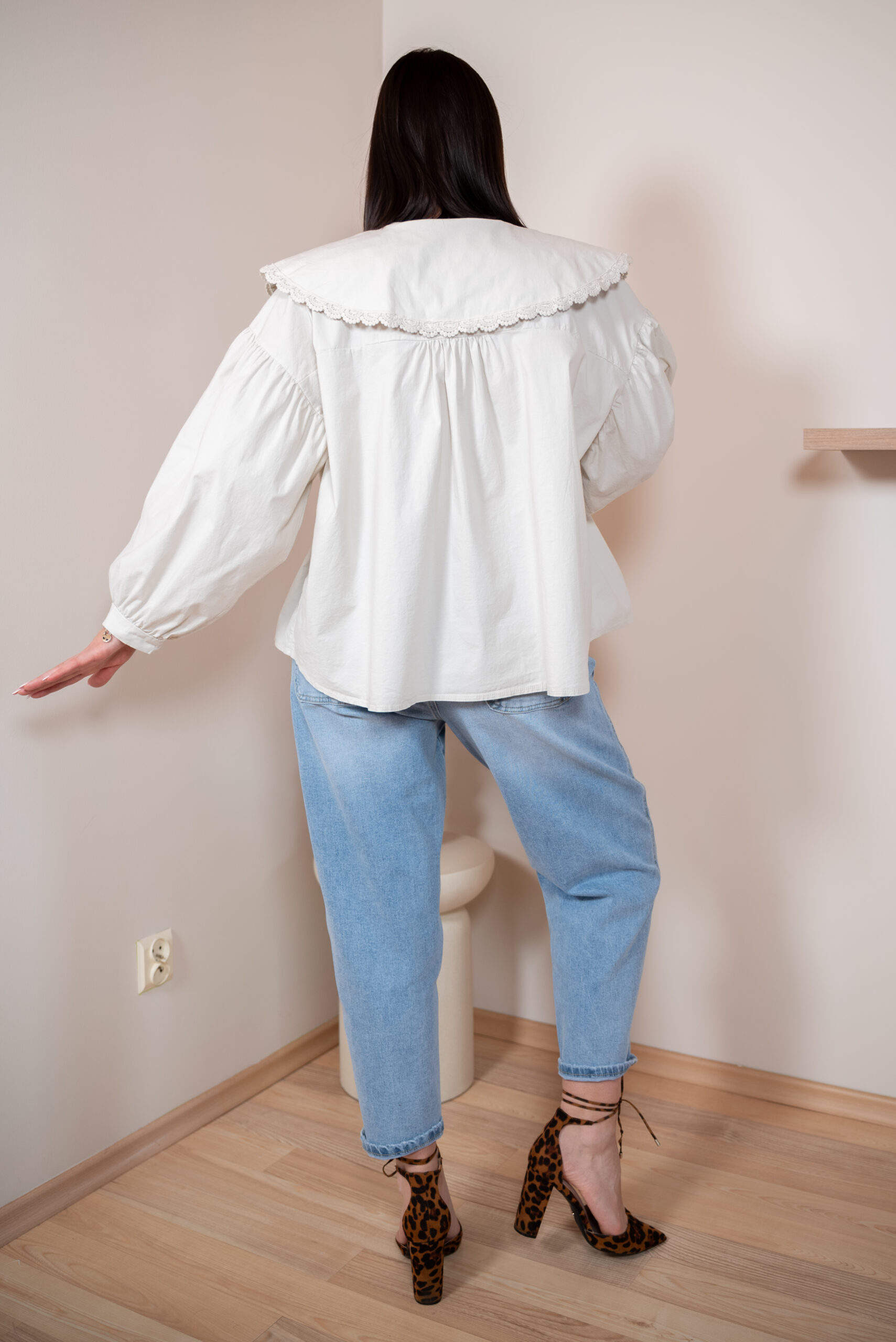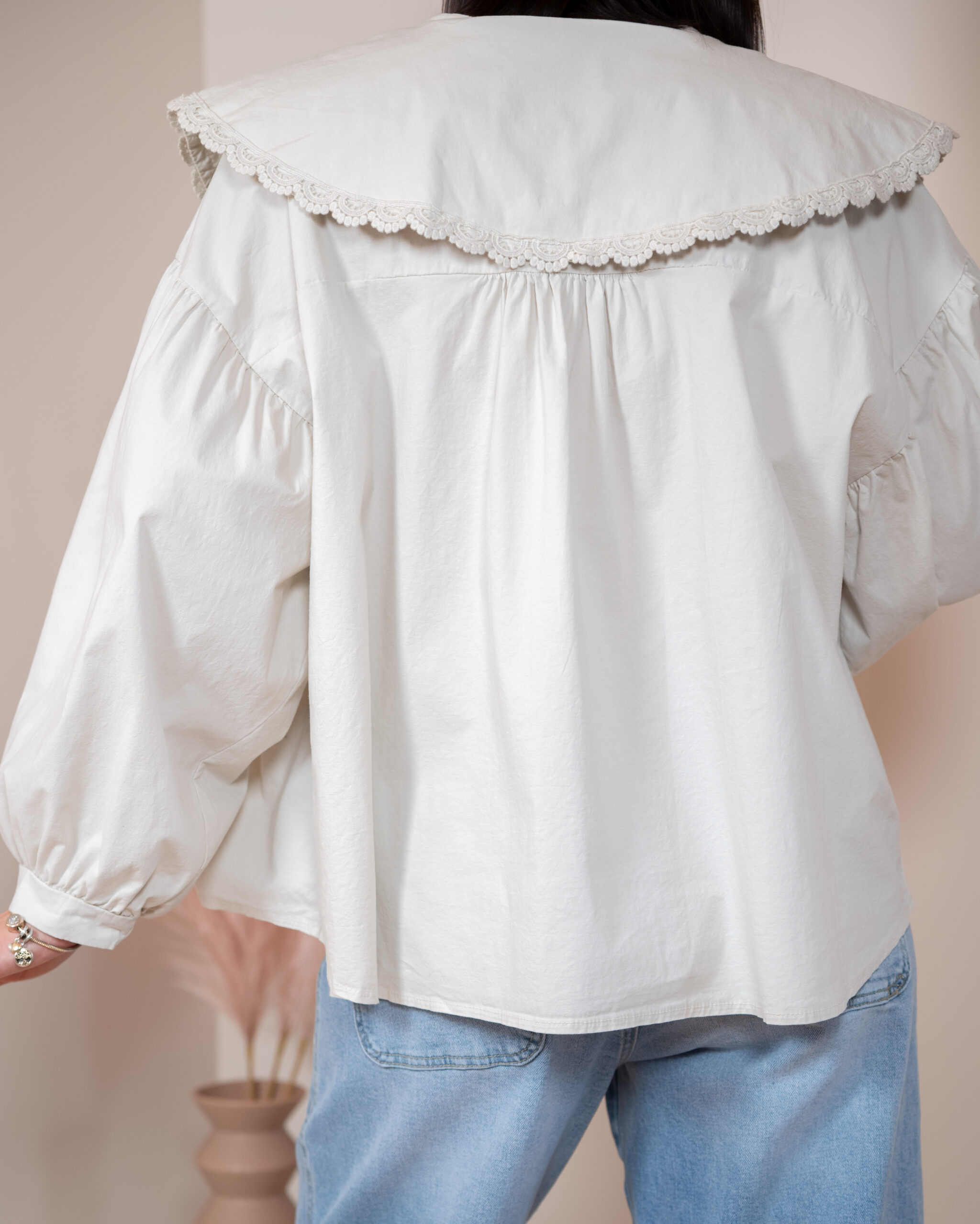 Szerokie, długie rękawy typu bufki zostały wykończone cienkim, eleganckim mankietem, który pięknie równoważy objętość rękawa. Główną rolę w tym modelu gra jednak duży, okrągły kołnierz obszyty delikatną koronką w tym samym kolorze – romantyczny, subtelny i niezwykle stylowy. Z przodu znajdują się dwa cienkie troczki, które można zawiązać w kokardę, dodając koszuli dziewczęcego uroku.
