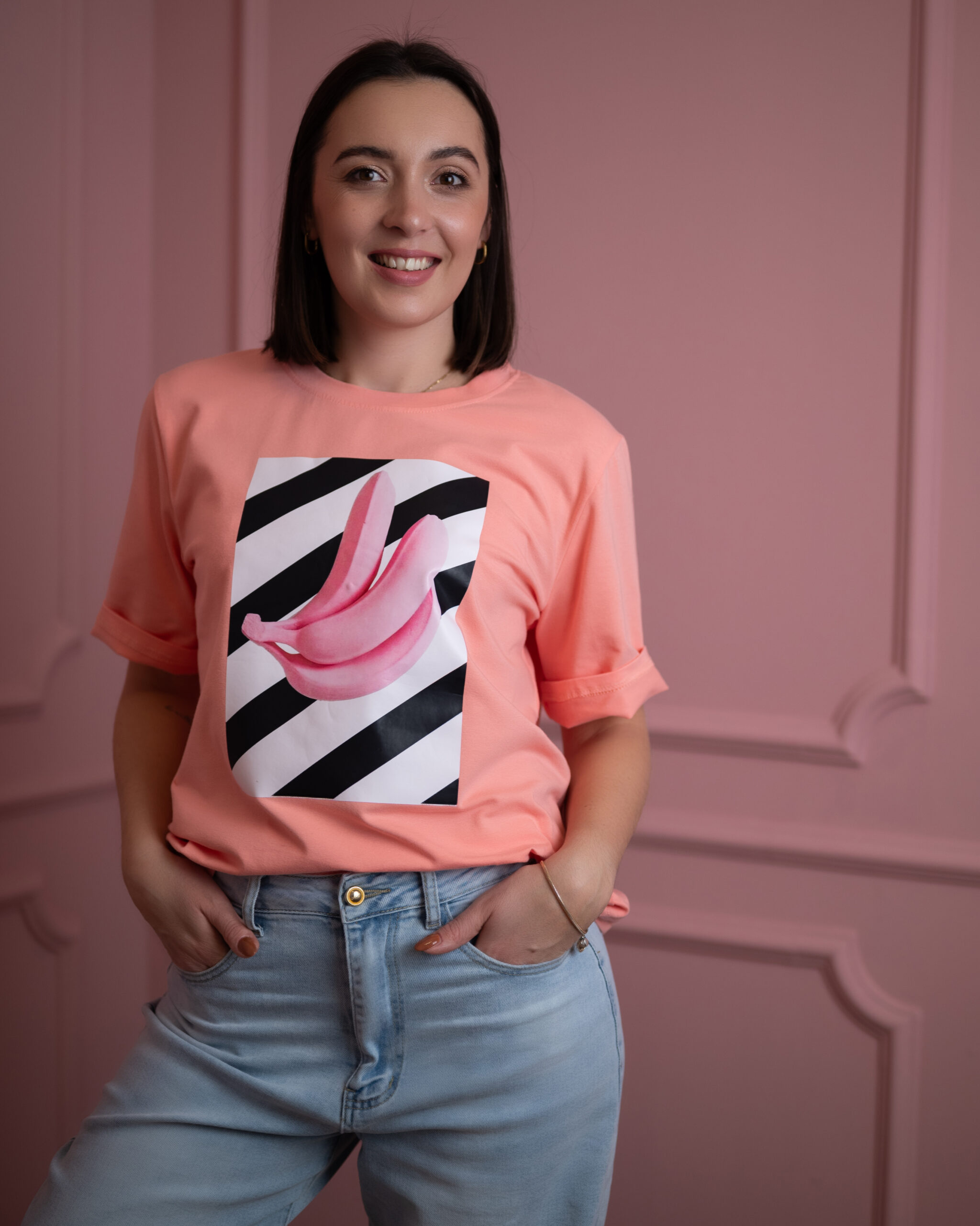 Czarny T-shirt Mila to odważniejsza odsłona basicu z nutą humoru. Nadruk croissanta, pudełkowy krój z bocznym rozcięciem oraz subtelnie zarysowane ramiona dzięki poduszkom nadają mu modowego charakteru. Idealny do miejskich stylizacji – zarówno z klasycznymi jeansami, jak i barwnymi spodniami czy spódnicami.