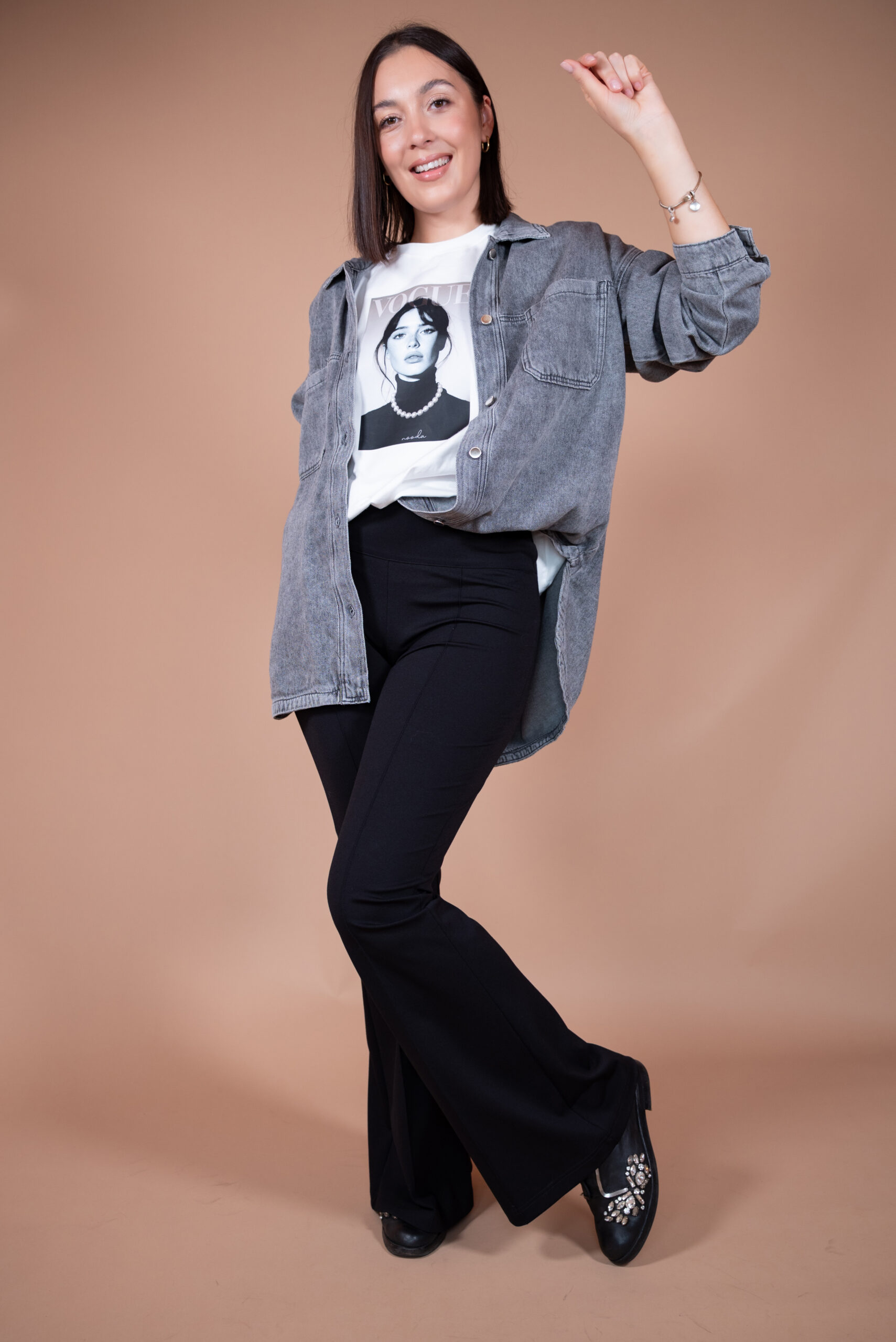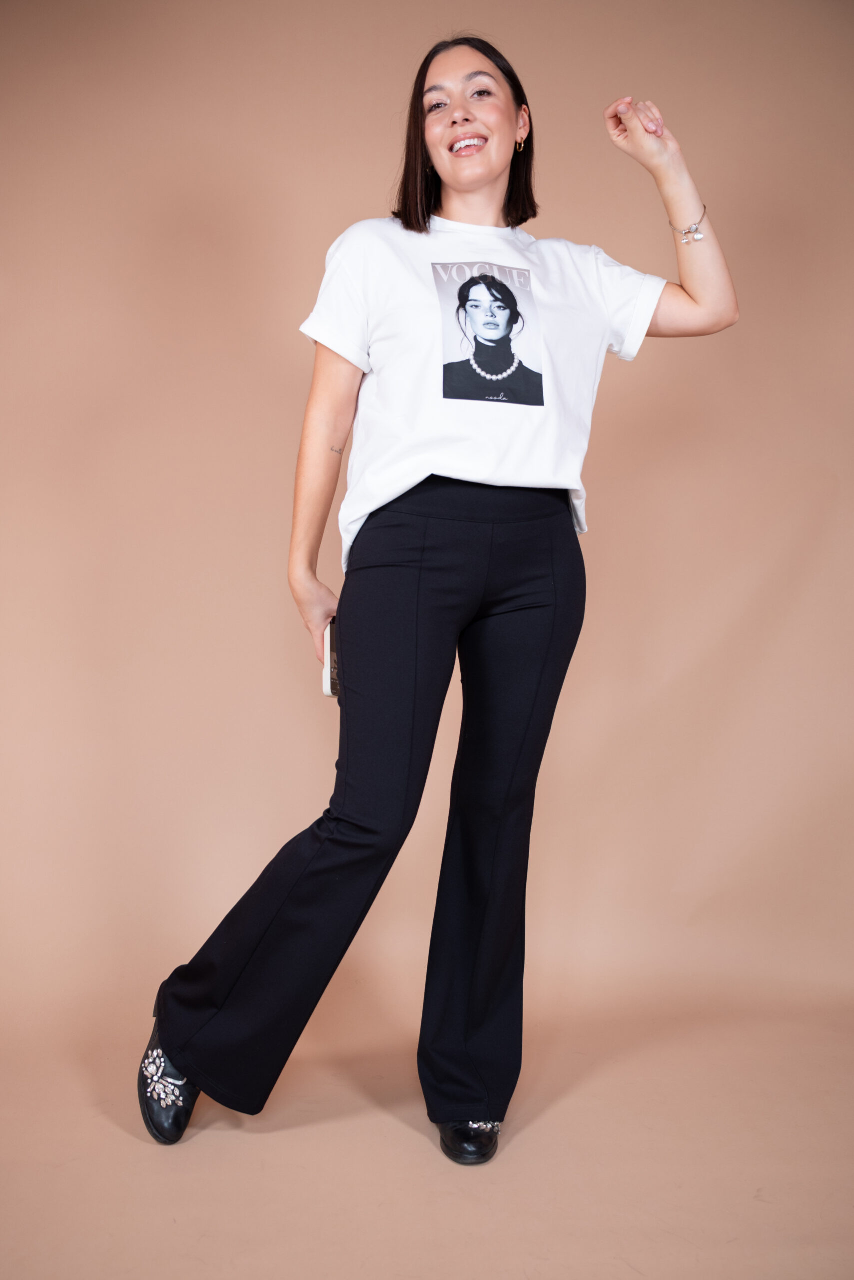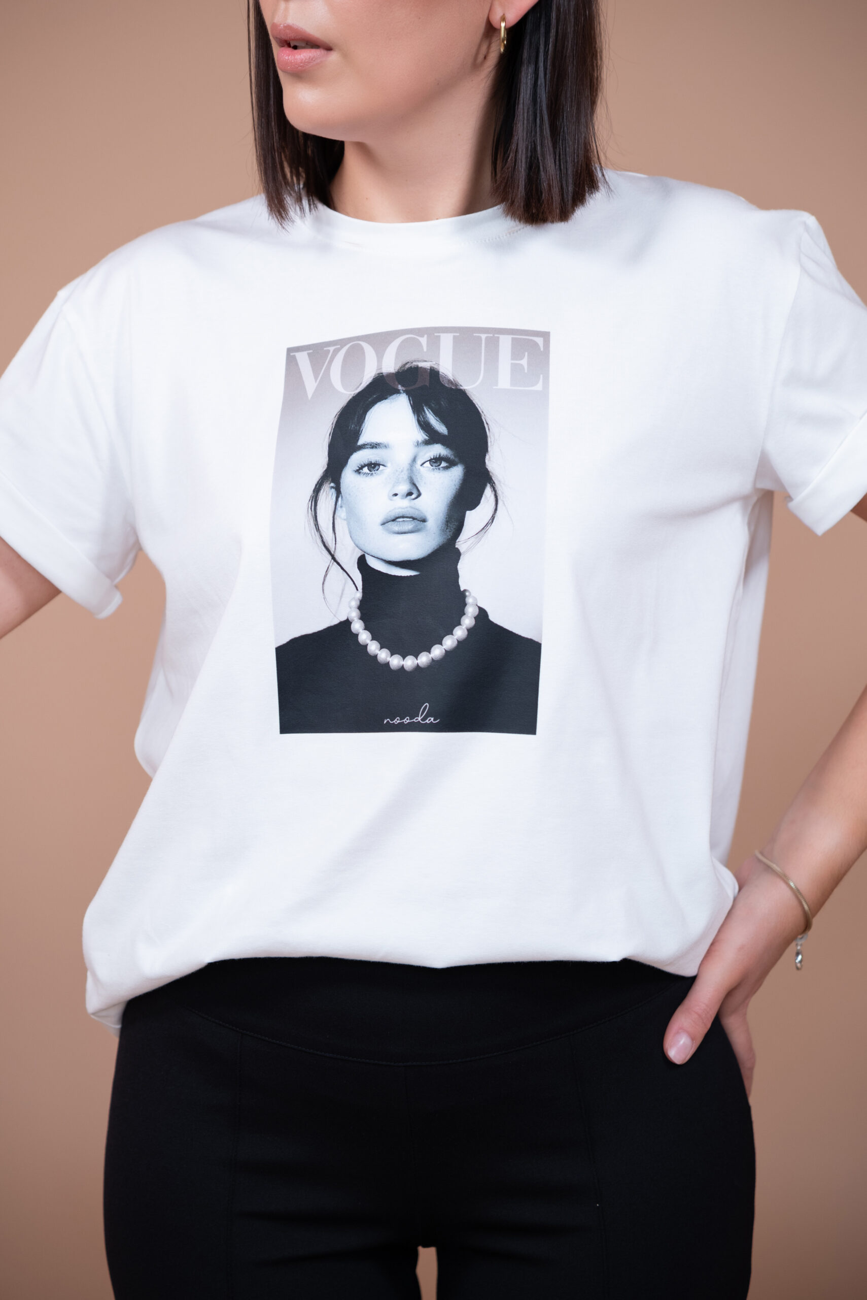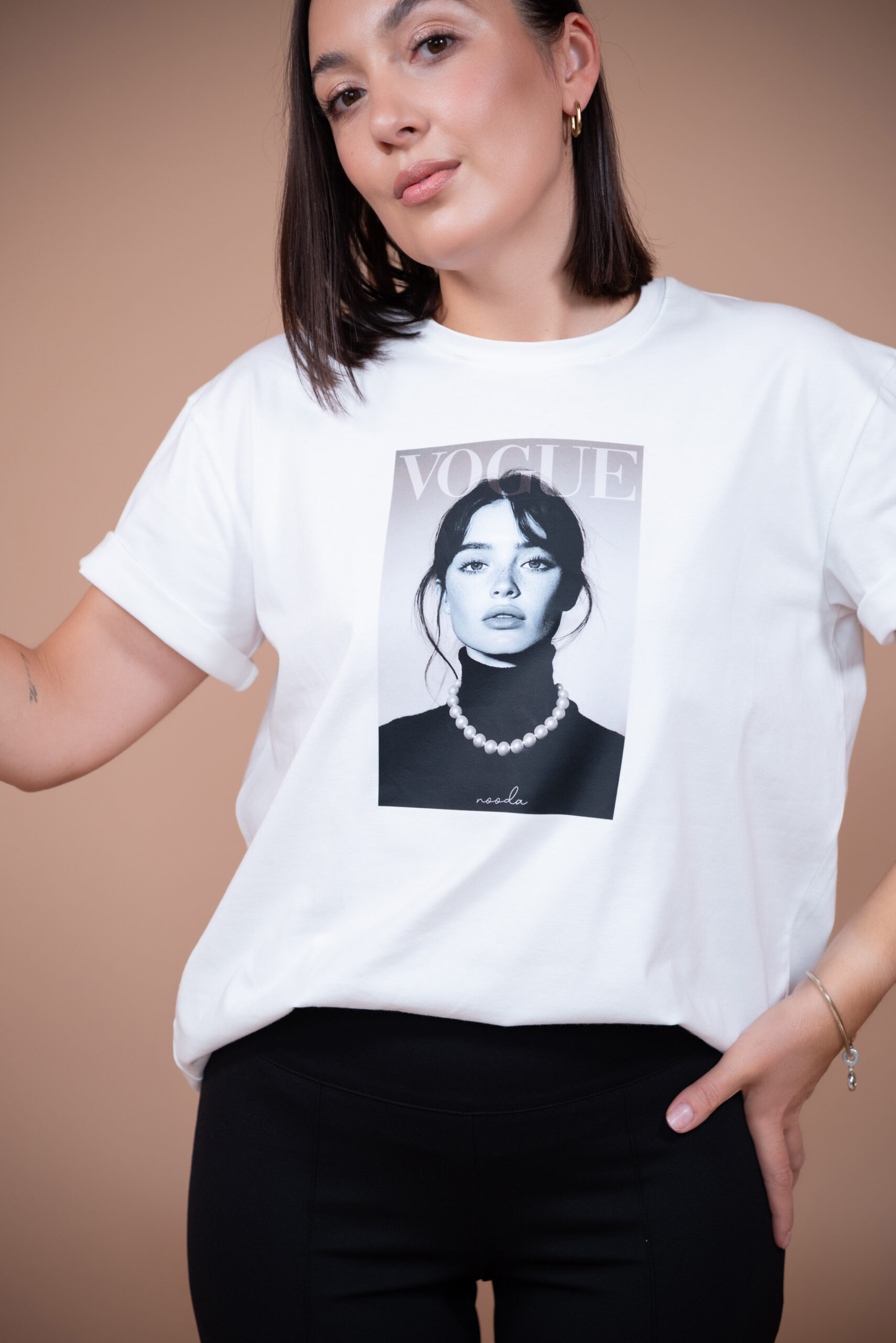 Klasyczny biały T-shirt o pudełkowym fasonie, który łączy prostotę z modowym akcentem. Na przodzie nadruk inspirowany kultową okładką „Vogue” z wizerunkiem kobiety nadaje mu wyjątkowego charakteru. Polski produkt o doskonałej jakości wykonania to propozycja dla kobiet, które cenią styl i wygodę. Świetnie wygląda zarówno w duecie z jeansami i marynarką, jak i w bardziej eleganckich zestawieniach.